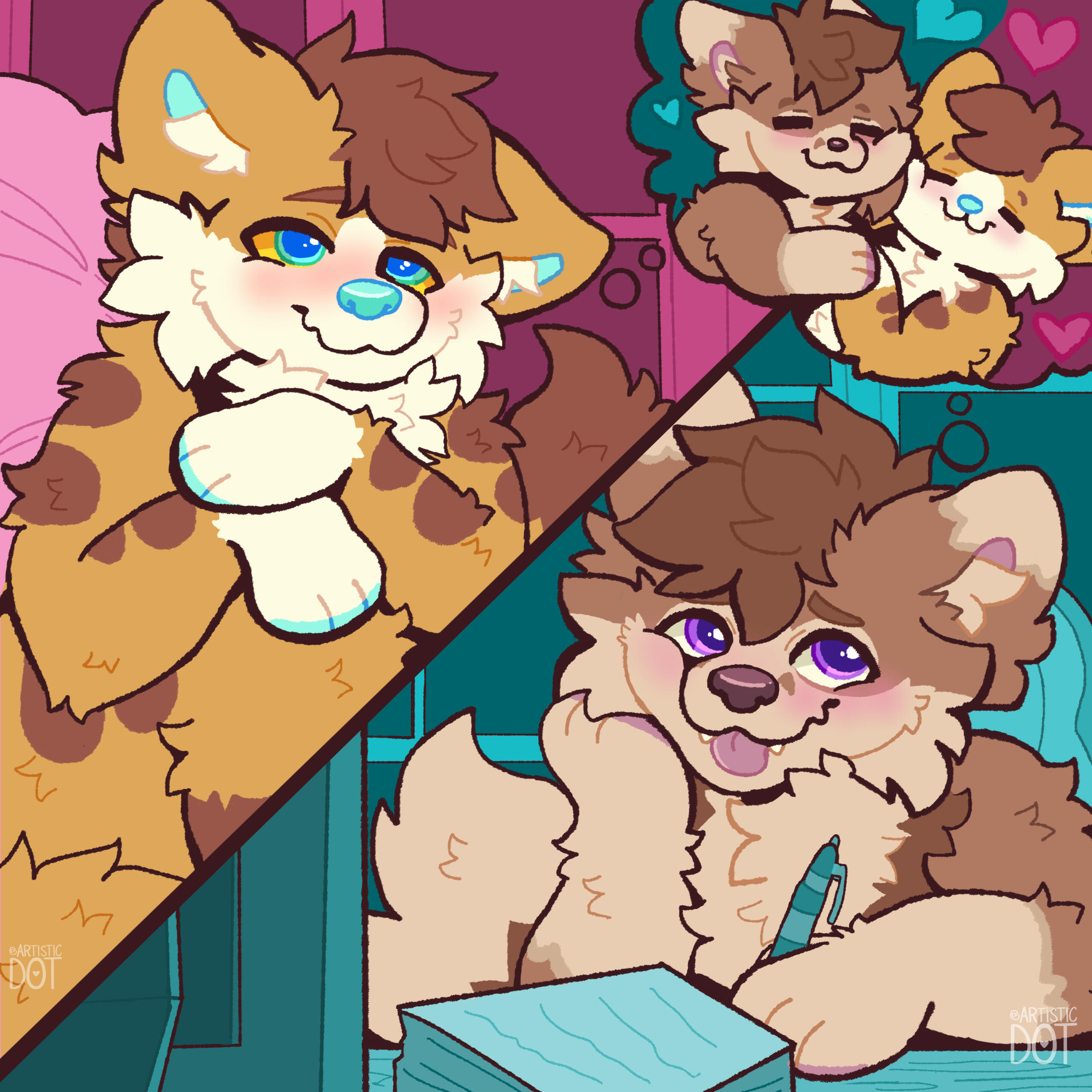 Extra version without plushies (to get both): +5 usd (https://t.me/artisticdotuwu/15184)🎨Collar/Socks/clothes colour will be custom, but artistic freedom, according to character pallete (can suggest prefered colours tho)✏️Any species and gender